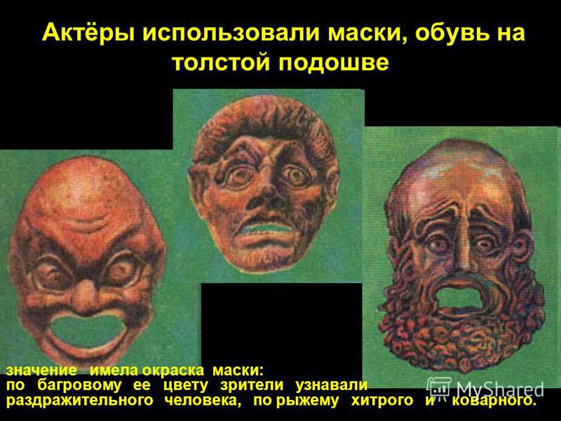 Актёры использовали маски, обувь на толстой подошве значение имела окраска маски: по багровому ее цвету зрители узнавали раздражительного человека, по рыжему хитрого и коварного.