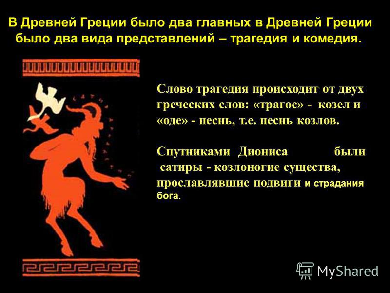 В Древней Греции было два главных в Древней Греции было два вида представлений – трагедия и комедия. Слово трагедия происходит от двух греческих слов: «трагос» – козел и «оде» – песнь, т.е. песнь козлов. Спутниками Диониса были сатиры – козлоногие существа, прославлявшие подвиги и страдания бога.