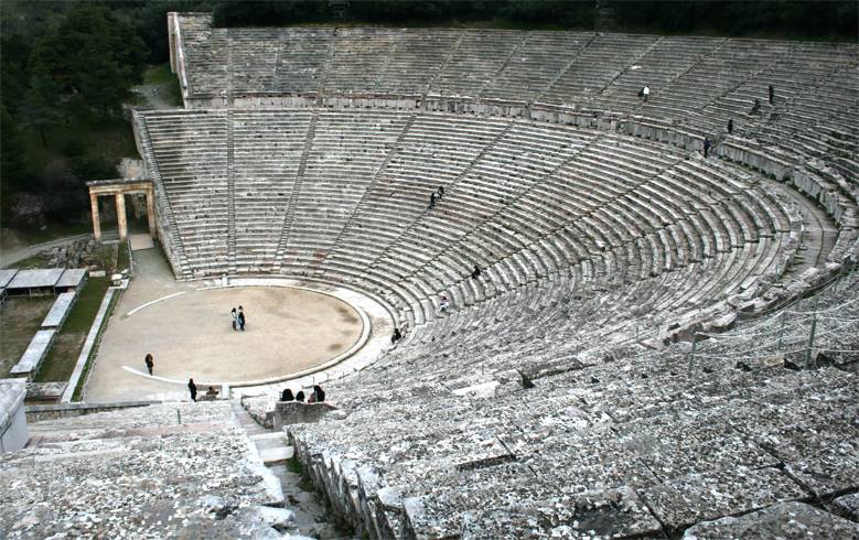 Древнегреческие театры проектировались с особым вниманием к акустике. Самый известный пример этого находится в Театр Эпидавра (на изображении, стоящем перед постом), расположенный примерно в 70 км к югу от Atenas