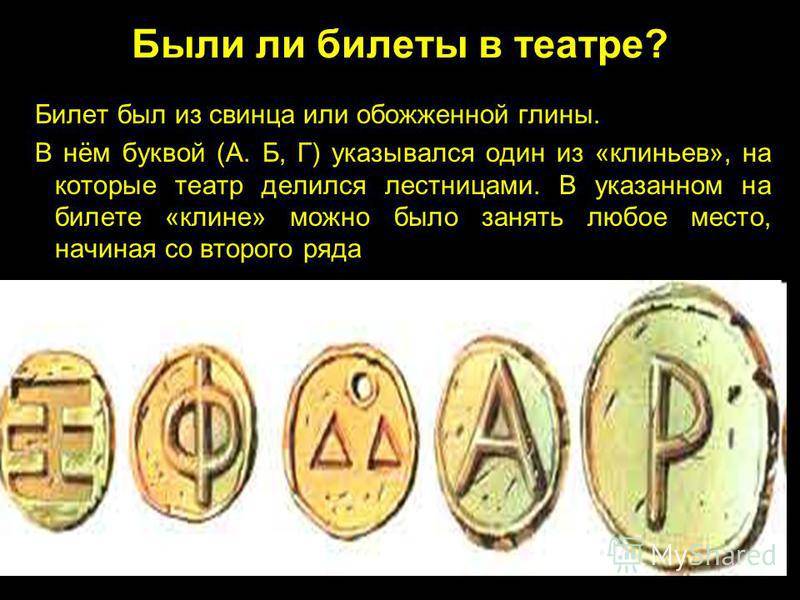 Билет был из свинца или обожженной глины. В нём буквой (А. Б, Г) указывался один из «клиньев», на которые театр делился лестницами. В указанном на билете «клине» можно было занять любое место, начиная со второго ряда Были ли билеты в театре?
