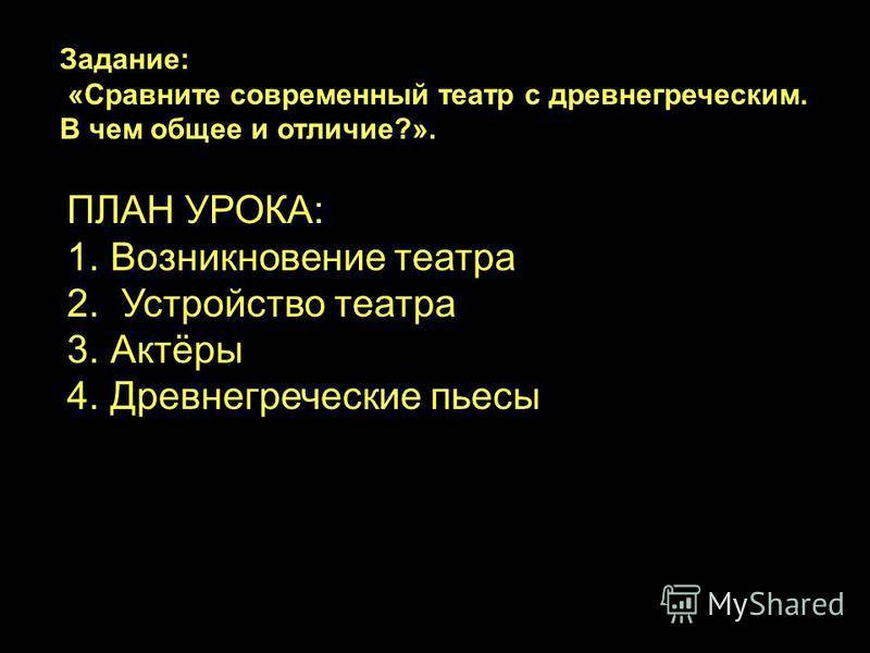 Проблемная задача: « Сравните современный театр с древнегреческим. В чем общее и отличие? ». Задание: «Сравните современный театр с древнегреческим. В чем общее и отличие?». « Сравните современный театр с древнегреческим. В чем общее и отличие? ». ПЛАН УРОКА: 1. Возникновение театра 2. Устройство театра 3.Актёры 4. Древнегреческие пьесы
