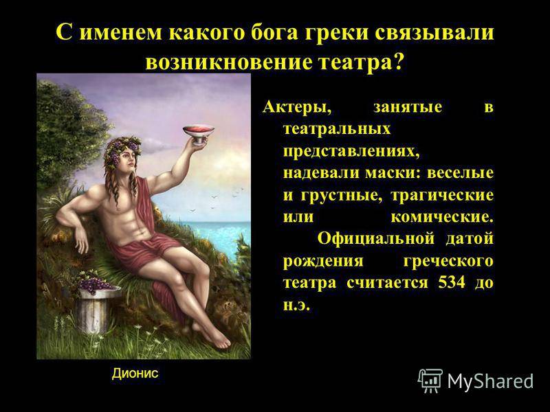 Актеры, занятые в театральных представлениях, надевали маски: веселые и грустные, трагические или комические. Официальной датой рождения греческого театра считается 534 до н.э. С именем какого бога греки связывали возникновение театра? Дионис