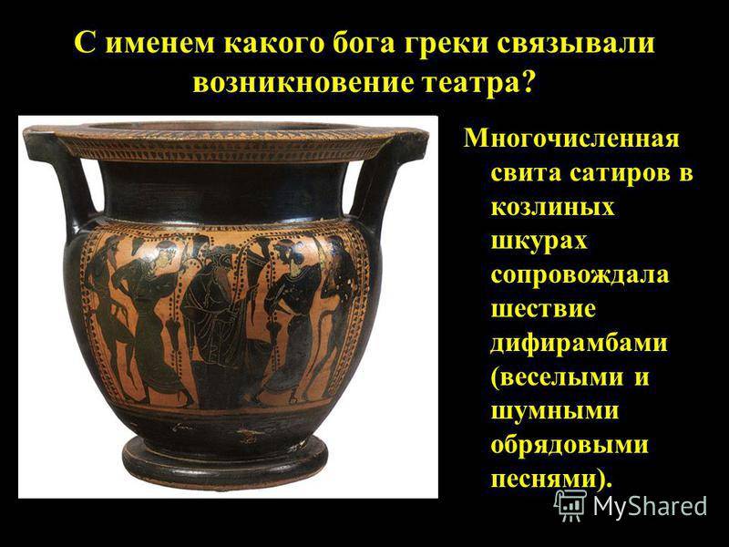 Многочисленная свита сатиров в козлиных шкурах сопровождала шествие дифирамбами (веселыми и шумными обрядовыми песнями). С именем какого бога греки связывали возникновение театра?