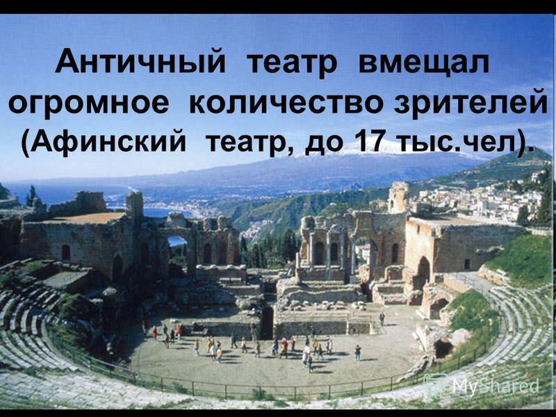 Античный театр вмещал огромное количество зрителей (Афинский театр, до 17 тыс.чел).