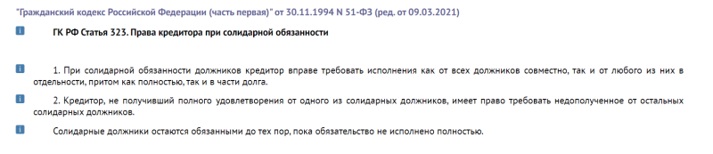 Права и обязанности поручителя регламентируются Гражданским Кодексом РФ статьей 553. Ответственность может быть солидарной, когда банк требует выплату как от заемщика, так и поручителя, так и субсидиарной, что наступает в случае, если у заемщика нет денег на погашение долга.