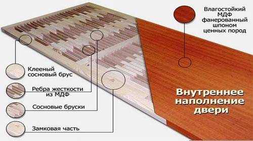 Чтобы снизить себестоимость, многие производители изготавливают из массива только каркас (например, из сосновых ламелей), а поверхность полотна покрывают рельефными или гладкими плитами МДФ (ДСП).