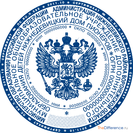 В юридическом плане печать отличается тем, что она используется для заверения подлинности подписи и документа. На ней отражены реквизиты фирмы или организации: форма собственности, название, ОГРН и ИНН.