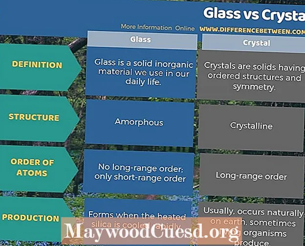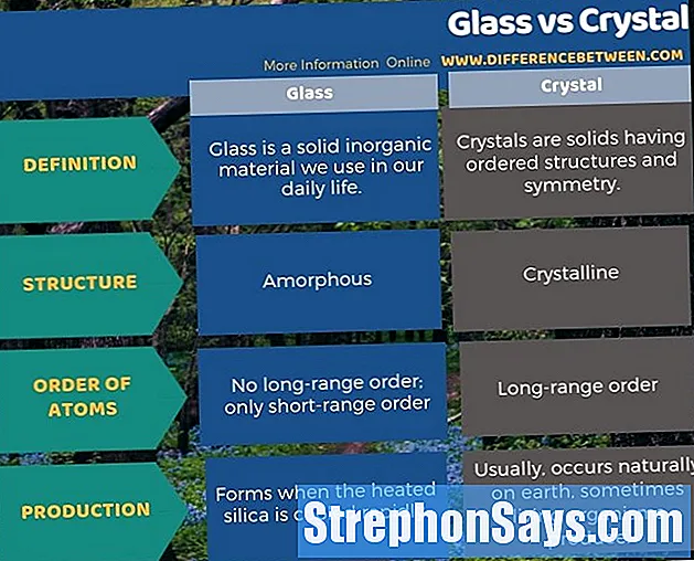 Стекло – это твердый неорганический материал, который мы используем в повседневной жизни, а кристаллы – это твердые тела с упорядоченной структурой и симметрией. Ключевое различие между стеклом и кристаллом состоит в том, что стекло имеет аморфную структуру, тогда как кристалл имеет кристаллическую структуру.Более того, стекло имеет только ближний порядок атомов, тогда как кристаллы имеют дальний порядок