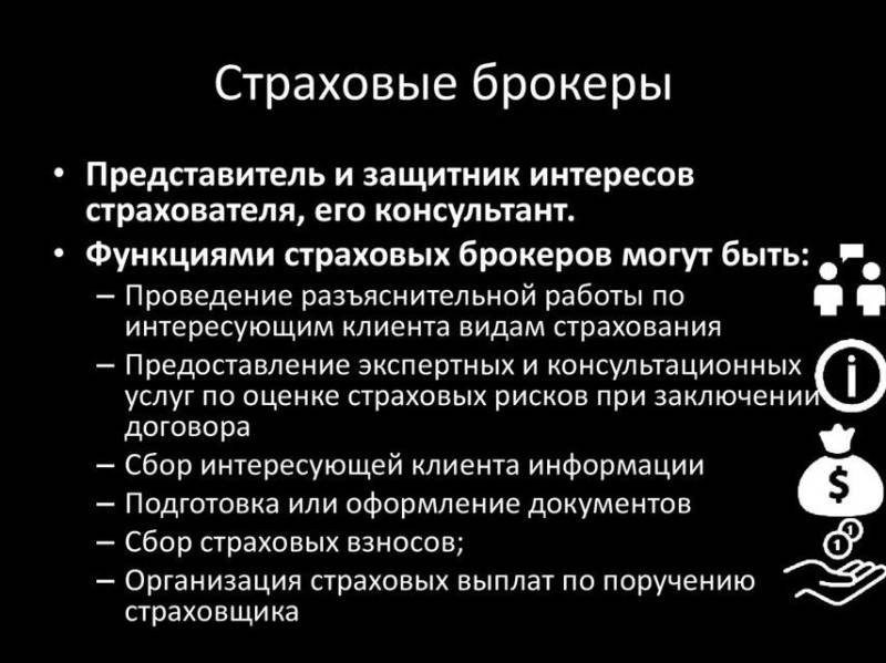 - Страховые брокеры ищут подходящих страховщиков на рынке и выбирают тех, которые лучше всего соответствуют потребностям клиента;