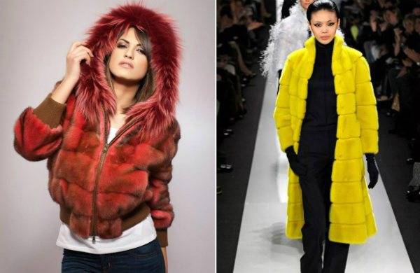 Разноцветные. Кроме естественных свойственных меху норки цветов в моде также и крашеные изделия. Это могут быть как однотонные шубы, выполненные в ярких палитрах, так и с градиентной растяжкой или цветными узорами.