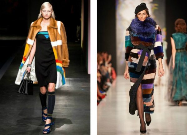 С поперечными меховыми полосками. Еще один модный в этом сезоне вариант оформления норковых шуб. В основе данного дизайна узкие или широкие полоски, которые сшиваются таким образом, дабы в готовом изделии они размещались горизонтально. Чаще всего оформляют такие шубы в очень светлых или темных оттенках. Однако, встречаются и модели с более нестандартными расцветками, например, в синем или зеленом цвете.