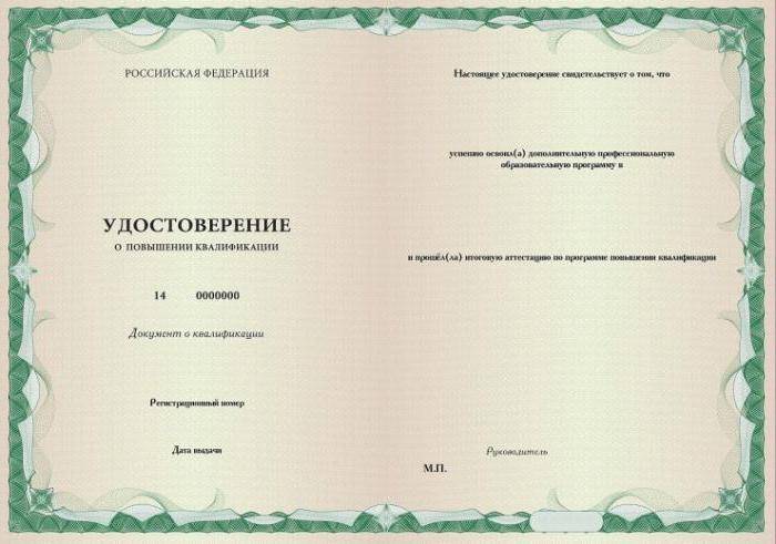 Удостоверение о повышении квалификации установленного образца на титуле должно содержать информацию об учреждении образования. Также там должен быть регистрационный номер, название города, в котором получен документ, дата, подписи должностных лиц и т. д. Бумага, из которой изготовлено удостоверение о повышении квалификации, не должна иметь видимого свечения, а также она должна быть изготовлена с применением не менее трех защитных волокон.