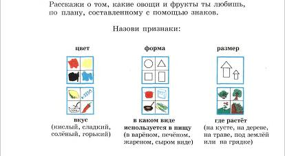 Посмотри внимательно на стол. Какие из лежащих на нем фруктов и овощей такой формы, как изображено на схеме: