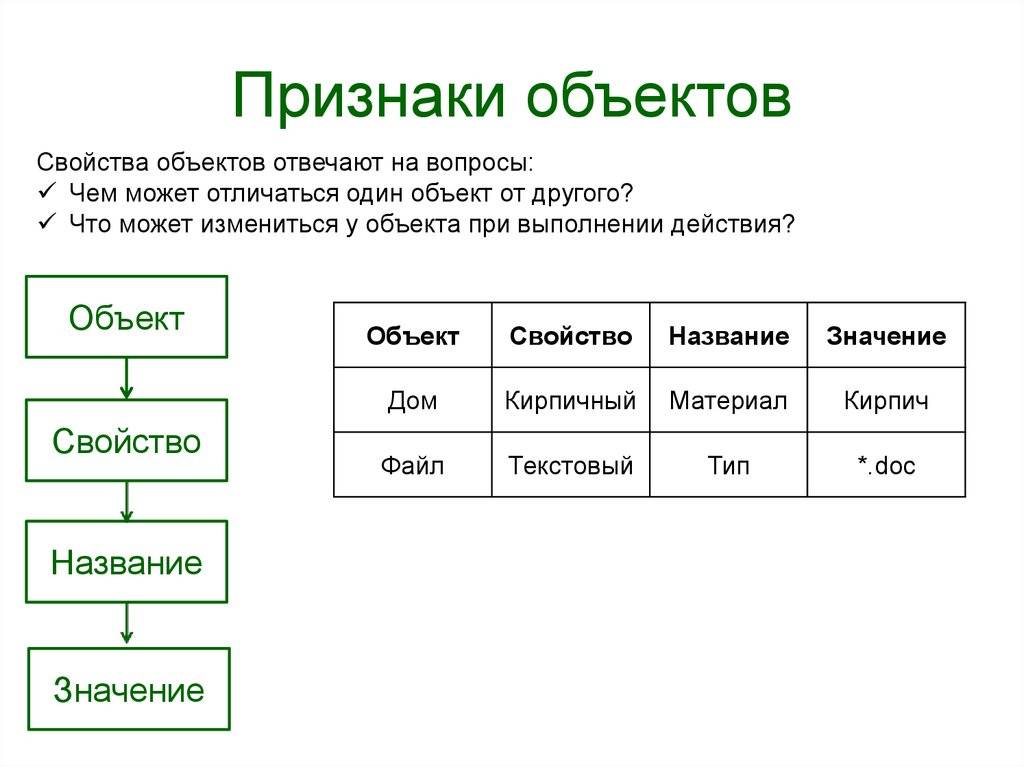 Различие между свойством и признаком заключается в их отношении к объекту. Свойство является более общим понятием и может применяться ко многим объектам, в то время как признак присущ только определенному объекту или группе объектов.