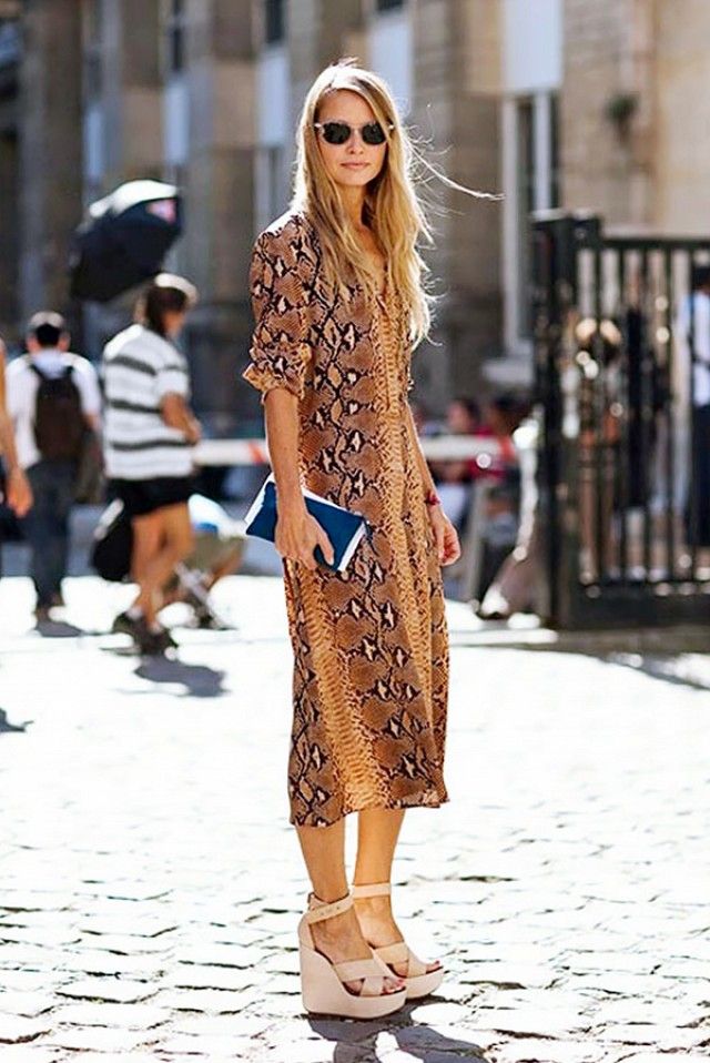 Светлые босоножки на танкетке и платье со змеиным принтом