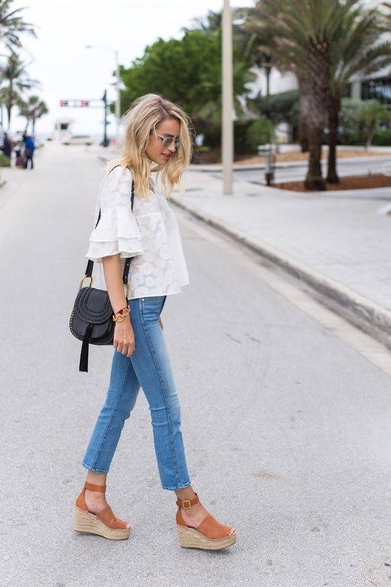 Летом подобрать одежду для своей любимой пары с танкеткой не составит труда. Использовать можно все: сарафаны из ситца, юбки, туники, шорты, легкие платья из шифона, ткани из льна, хлопка и шелка, джинсы. Последние можно не боясь подворачивать – восприятие роста нарушено не будет. Рекомендуется надевать максимально длинные платья, сарафаны.