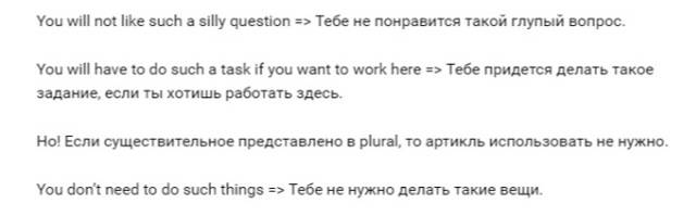 При этом, если после местоимения «such» идет существительное в единственном числе, то перед ним ставится неопределенный артикль «a/an», а с существительными в форме множественного числа не употребляется артикль.