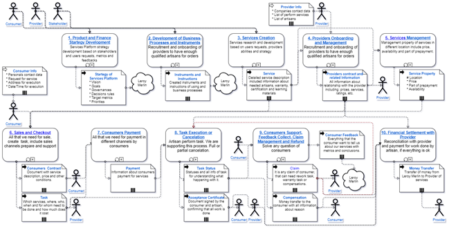 Для нахождения границ мы выписали все группы бизнес-процессов, которые задействованы при выполнении услуг и на которые продуктовая команда имеет влияние. Получилась схема, помещающаяся на А4, которая и стала описанием границ продукта.