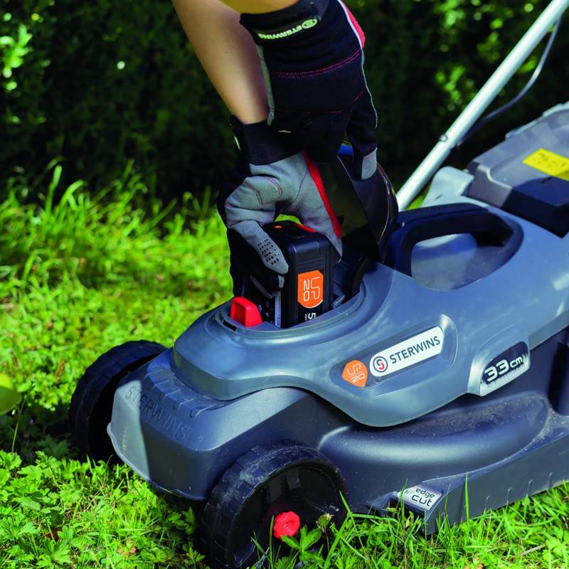 Если участок невелик, до 2-3 соток, оптимальным выбором может стать газонокосилка с шириной кошения 32-34 см. Например, легкая и компактная аккумуляторная косилка Sterwins 20 В с небольшой шириной захвата (33 см) может маневрировать на участках с различными контурами.
