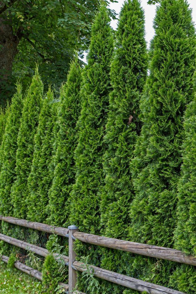 Вот туя для этой задачи подходит идеально. При относительно невысокой цене саженцев и хорошем уходе, ваша живая стена поднимется достаточно быстро. Для этих целей хорошо использовать туи «Columna» или «Brabant», которые отлично переносят стрижку.
