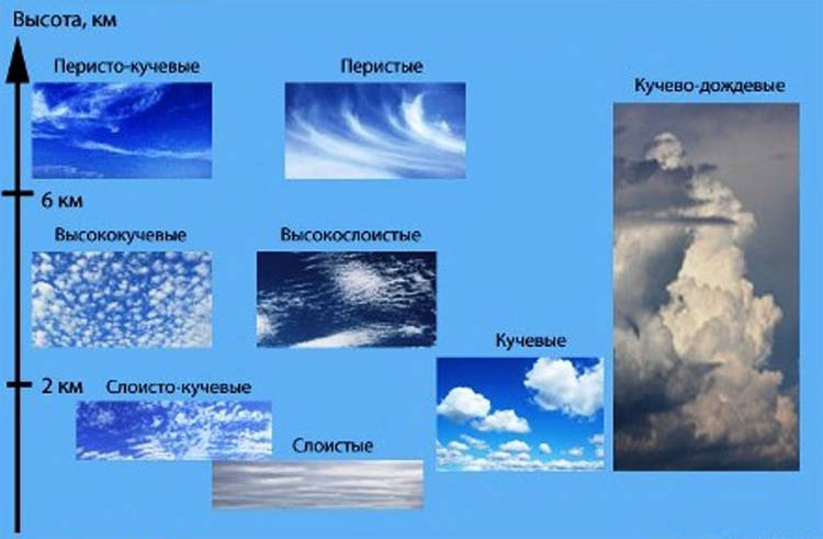 Существует несколько типов облаков и туч, которые можно классифицировать по их высоте и форме: