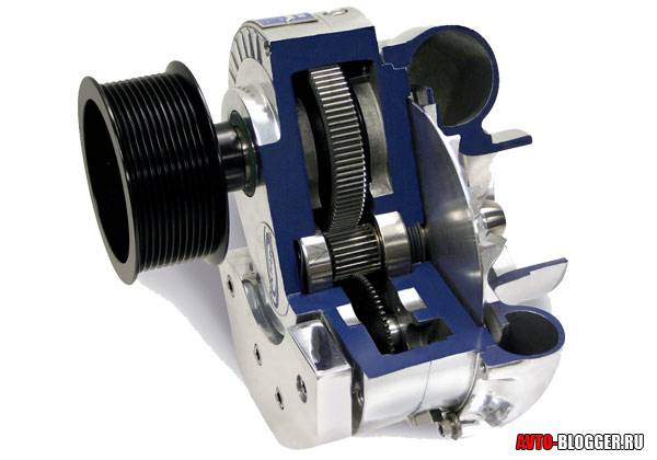 Более простой по своей конструкции компрессор чаще всего вращается ременным приводом от двигателя. Наиболее распространенные центробежные нагнетатели при помощи крыльчатки прогоняют воздух через свой корпус и отправляют его через впускной коллектор в цилиндры, чем и добавляют двигателю мощности. Главное достоинство такого типа нагнетателя — это постоянная работа, вне зависимости от оборотов мотора. Кроме того среди плюсов можно выделить неприхотливость работы, более низкую стоимость по сравнению с турбиной, относительную легкость монтажа и широкий ассортимент в выборе.