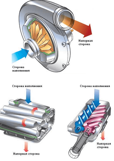 Существует три типа компрессоров: центробежный, роторный и винтовой. Основное отличие между ними заключается в способе сжатия воздуха и его подаче на впуск двигателя.