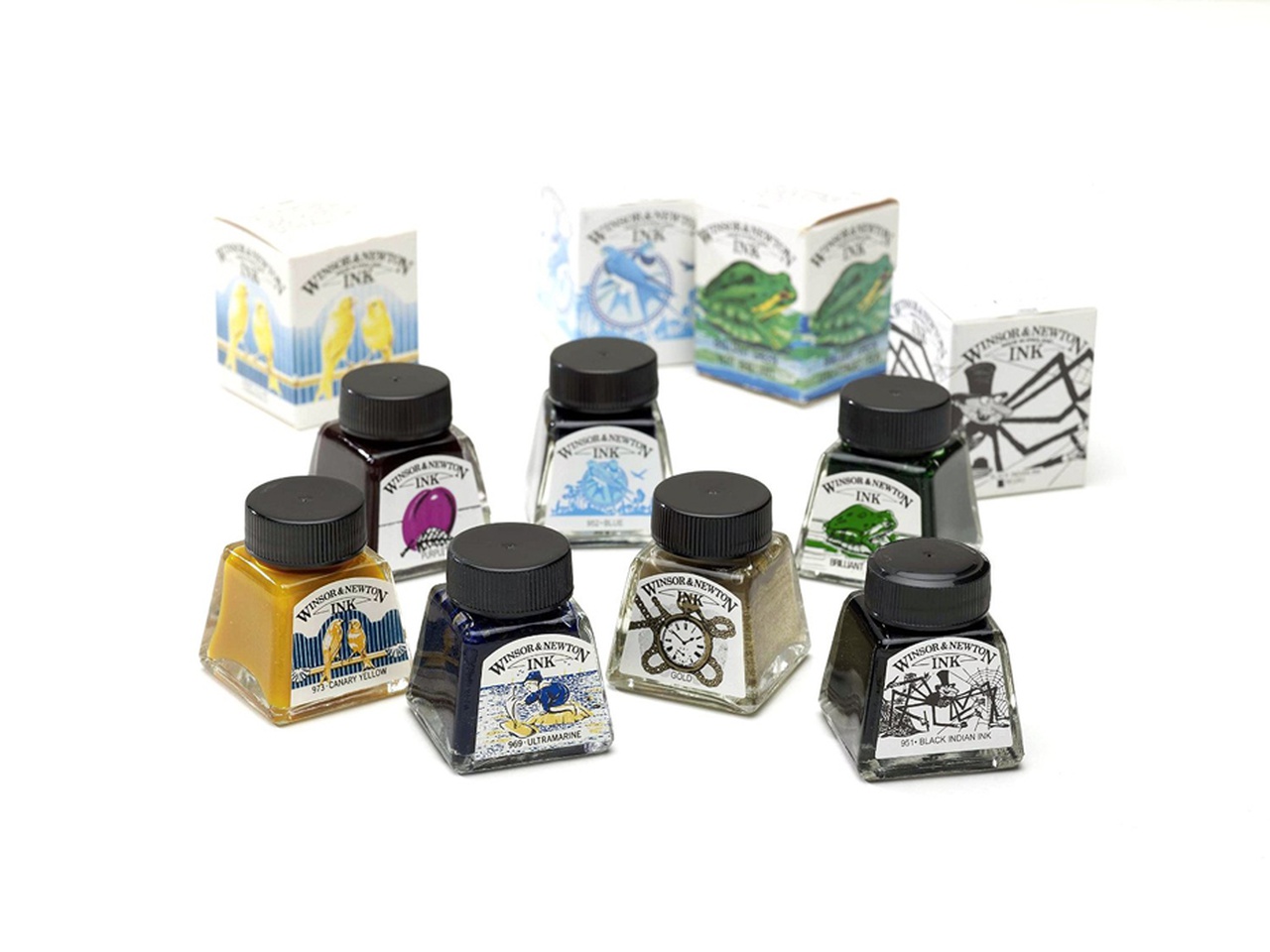 Штрихи тушью чуть бледнее и медленнее высыхают. Они, как уже упоминалось выше, могут подтекать, а при нанесении слоёв друг на друга они имеют заметные границы. Со временем работы, выполненные чернилами склонны выцветать. Но чернила бывают не только в виде растворов, но и взвесей с пигментом, в этом случае их выцветаемость заметно снижается. Мы уже поняли, что такое тушь и чернила и чем они отличаются. Исходя из этого, можно дать некоторые рекомендации относительно работы с ними. Итак, поскольку чаще всего тушь более плотная по цвету, то с её помощью можно получать чёткие линии, и выполнять, например, каллиграфические работы. Графика и чертежи также благоволят к использованию туши. Плюс ко всему, работы, выполненные тушью дольше хранятся, и не теряют цвет. Чернила используются для работы с штампами и печатями, ими заполняются стержни авторучек. Впрочем, чернила бывают разными, и сегодня можно найти чернила с довольно насыщенным цветом, поэтому грань между чернилами и красками постепенно стирается. Например, среди художников получили широкое распространение чернила на акриловой основе — Amsterdam Ink Производители туши также не стоят на месте. Например, тушь Sennelier имеет усовершенствованную формулу, поэтому обладает глубоким цветом, хорошо ложится и «держит» свет и воду. А Winsor & Newton предоставлятет богатый выбор оттенков.