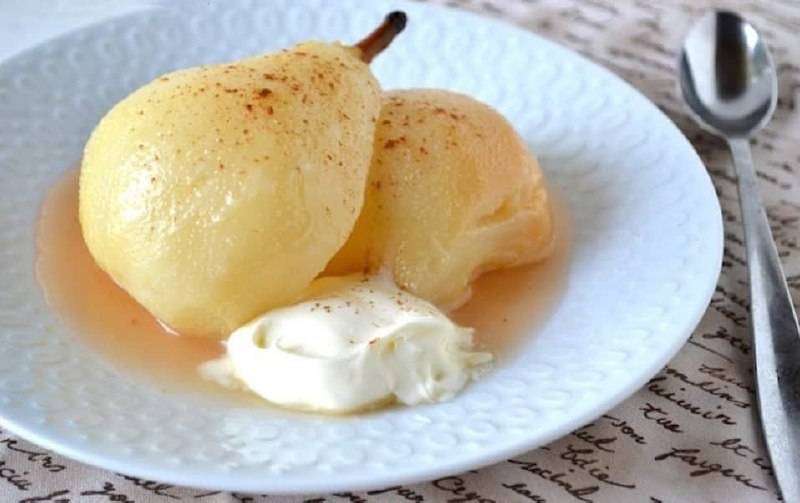 Подача. На тарелки выложите грушу, полейте остывшим сиропом и рядом выложите крем.