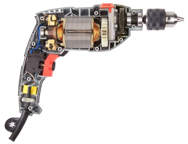 Ударные дрели состоят из нескольких основных узлов: корпус инструмента, электродвигатель, редуктор, подшипники, кнопки включения и регулировки оборотов, патрон.