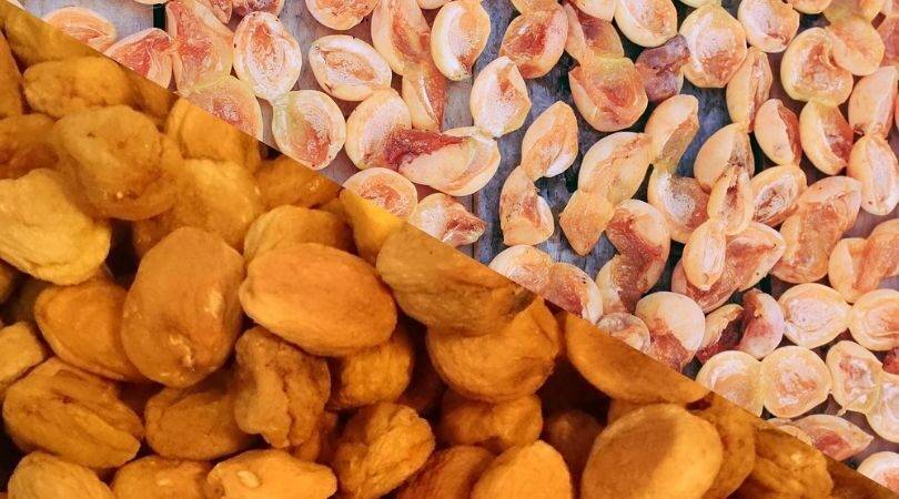 Методы заготовки кураги могут немного отличаться у разных народов — у казахов это сушка на листах жести, у узбеков — обработка в коптилках, вяление на солнце с нанизыванием абрикосов на нитку. И половинки, и разделенные почти пополам целые плоды (с разрезом) — всё это курага.