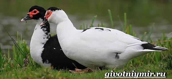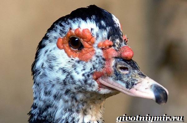 На небольшой голове, расположен плоский клюв, а вокруг глаз имеется своеобразный нарост красного цвета, который отличает их от простых уток. Если к нему прикоснуться, можно почувствовать слабый мускусный запах.