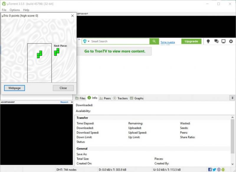 Finally, on a much more trivial topic, uTorrent includes a very entertaining Easter egg and BitTorrent does not. If you go to the About uTorrent section and click on the letter T, you can play a classic video game, Tetris.