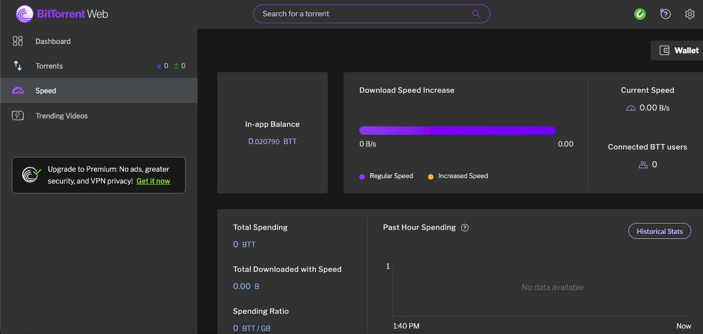 BitTorrent Speed is accessible via BitTorrent Web. And it is a built-in app with a crypto wallet and BTT tokens that can be earned by sharing and that can also help you increase torrenting speed. Speed can also be accessed via the uTorrent Web-based client.