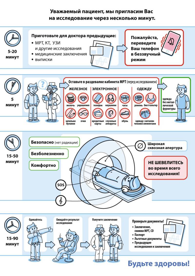 В случае с МРТ, тело больного находится под действием магнитного поля на протяжении 30-90 минут (зависит от области сканирования и типа диагностики).