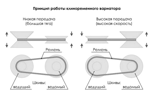 - Когда ведущий шкив максимально раздвинут, то металлический ремень ходит по маленькому диаметру (низкая передача), что равносильно первой передачи.