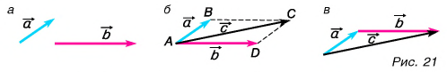 Совместим начала векторов (рис. 21, а), сохраняя их направления (рис. 21, б). Построим параллелограмм ABCD, принимая векторы за его стороны. Сумма векторов есть вектор совпадающий с диагональю АС параллелограмма: (см. рис. 21, б).
