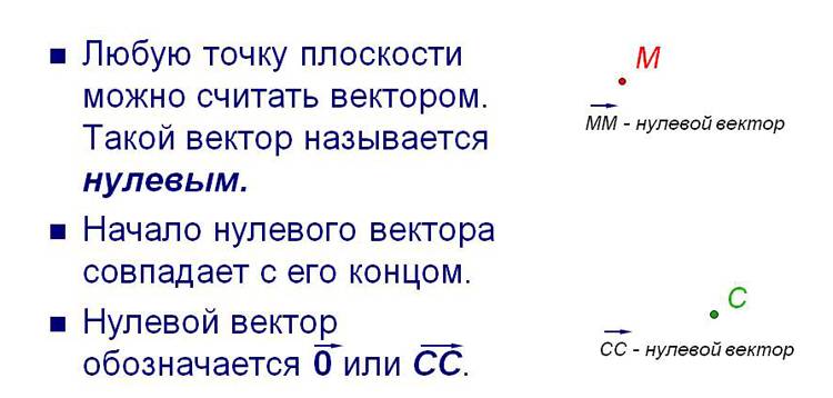 В векторной алгебре существует понятие нулевого вектора. Под этим понятием подразумевается точка. Что касается направления нулевого вектора, то оно считается неопределенным. Для обозначения нулевого вектора используется арифметический нуль, набранный полужирным шрифтом.