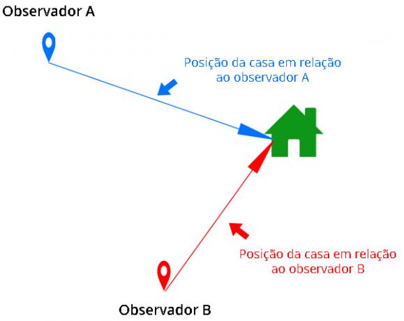 На рисунке показано, что положение дома является векторной величиной, поскольку зависит от взглядов наблюдателей A и B.