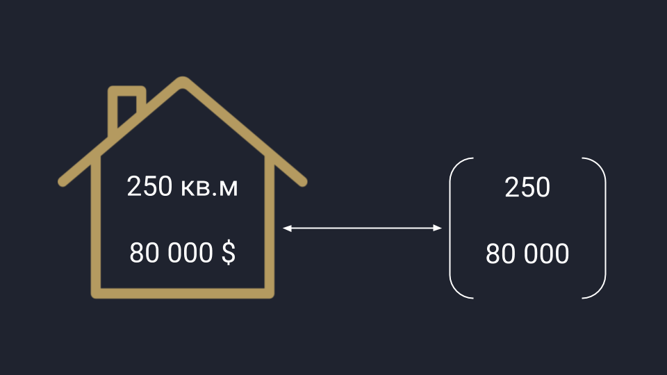 У аналитиков вектор представляется в виде упорядоченного списка чисел: это может быть любая информация, которую можно измерить и последовательно записать. Для примера возьмём рынок недвижимости, который нужно проанализировать по площади и цене домов — получаем вектор, где первая цифра отвечает за площадь, а вторая — за цену. Аналогично можно сортировать любые данные.