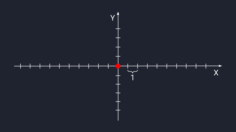 Векторная система координат с базовыми осями Х и Y. Место их пересечения — начало координат и корень любого вектора. Засечки на осях — это отрезки одной длины, которые мы будем использовать для определения векторных координат