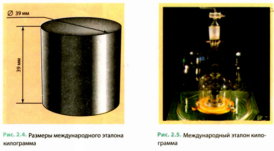 За единицу массы в Международной системе единиц (СИ) принят килограмм (1 кг). Это одна из основных единиц СИ, поэтому для него существует эталон. Современный эталонный килограмм представляет собой цилиндр, изготовленный из сплава платины и иридия (рис. 2.4). Международный эталон килограмма (рис. 2.5) сохраняется во Франции, неподалеку от Парижа. С этого эталона сняты точные копии, которые есть во многих странах, в частности, в Украине.