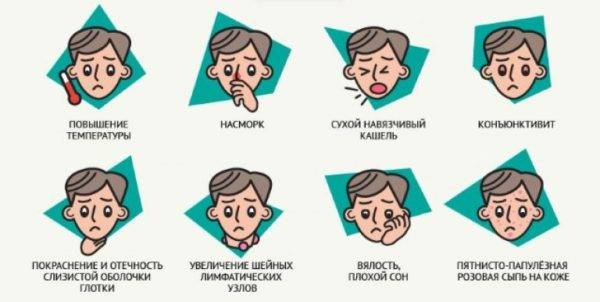 - при коревой форме – ринит, коньюктивит, удушающий кашель.