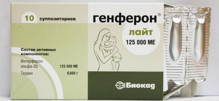 | Генферон Лайт | 125000, 250000 | Таурин – 5 | Твердый жир, декстран 6000, макрогол, полисорбат, эмульгатор, вода, лимонная кислота | Детям до 7 лет показан Генферон в дозировке 125000МЕ |