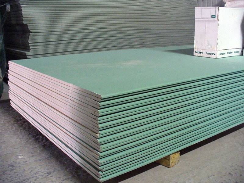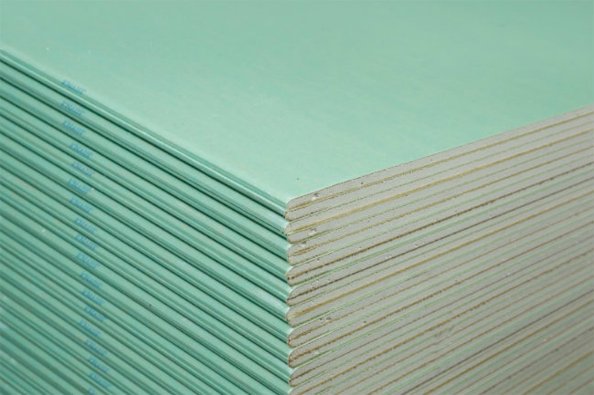 Влагостойкие листы гипсокартона выделяются своей уходящей в зеленый цветовой гаммой и характеристиками, поскольку структура панелей обрабатывается влагостойкими, антигрибковыми и импрегнированными растворами, повышающими степень устойчивости при использовании материала во влажной среде. Подобные ингредиенты, введенные в влагостойкий гипсокартон