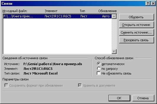 - Выберите Правка, Связи (Edit, Links), появляется диалоговая панель Связи (Links).