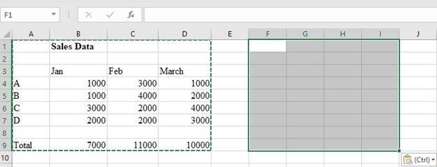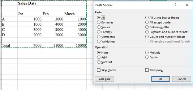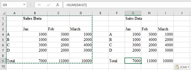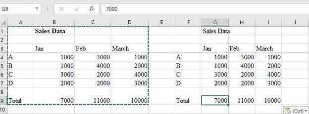 Если пользователь выбирает формулы, данные будут вставлены в новое место с формулами следующим образом. В новой копии подсчитываются итоги, и для расчета используются новые ячейки. Всего 7000 в G9 – это сумма от G4 до G7. Формула отображается в строке формул.