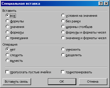 | Пропускать пустые ячейки | Можно выполнить действия только для ячеек, содержащих информацию, т. е. при специальном копировании пустые ячейки не разрушат существующие данные |