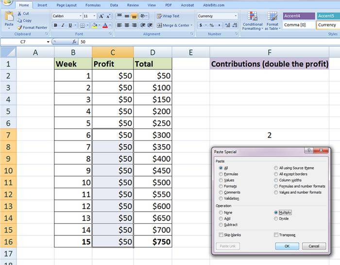 Весь доход, начиная с 6-й недели, будет умножен на 2.Чтобы показать новые цифры, нам нужно умножить соответствующие ячейки столбца C на 2. Мы можем выполнить это вручную, но будет гораздо приятнее, если за нас это сделает Excel с помощью команды Paste Special (Специальная вставка) > Multiply (Умножить). Для этого скопируйте ячейку F7 и примените команду на ячейки C7:C16. Итоговые значения обновлены. Отличная работа!
