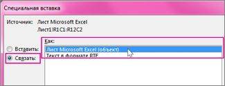 Типы вставки связи доступны из списка Как (As) панели диалога Специальная вставка (Paste Special).